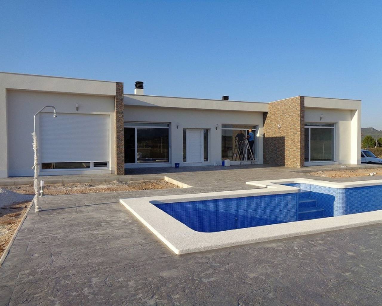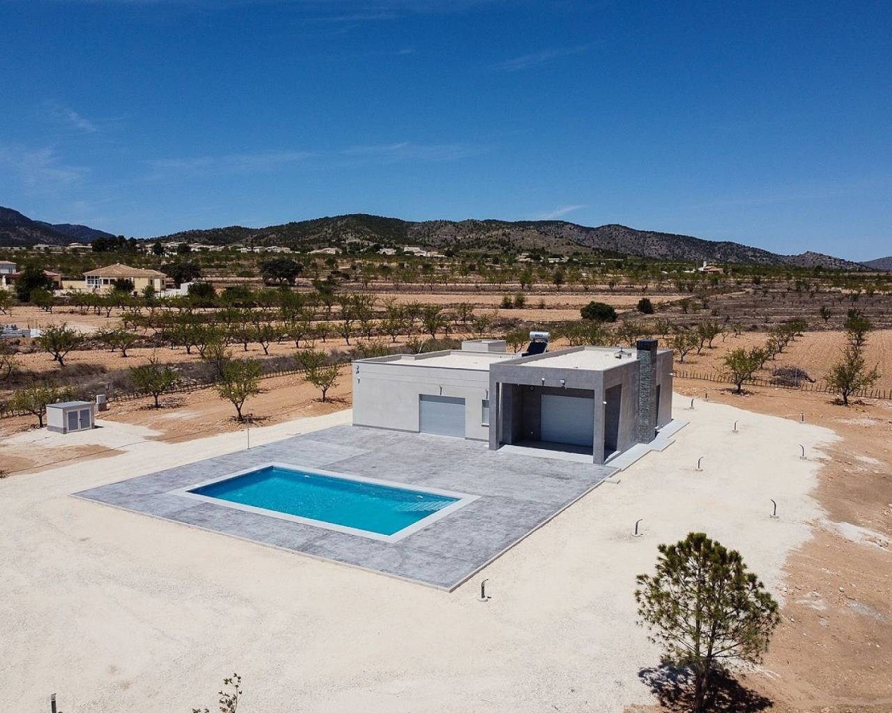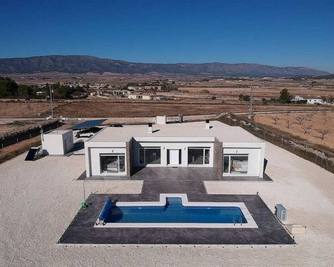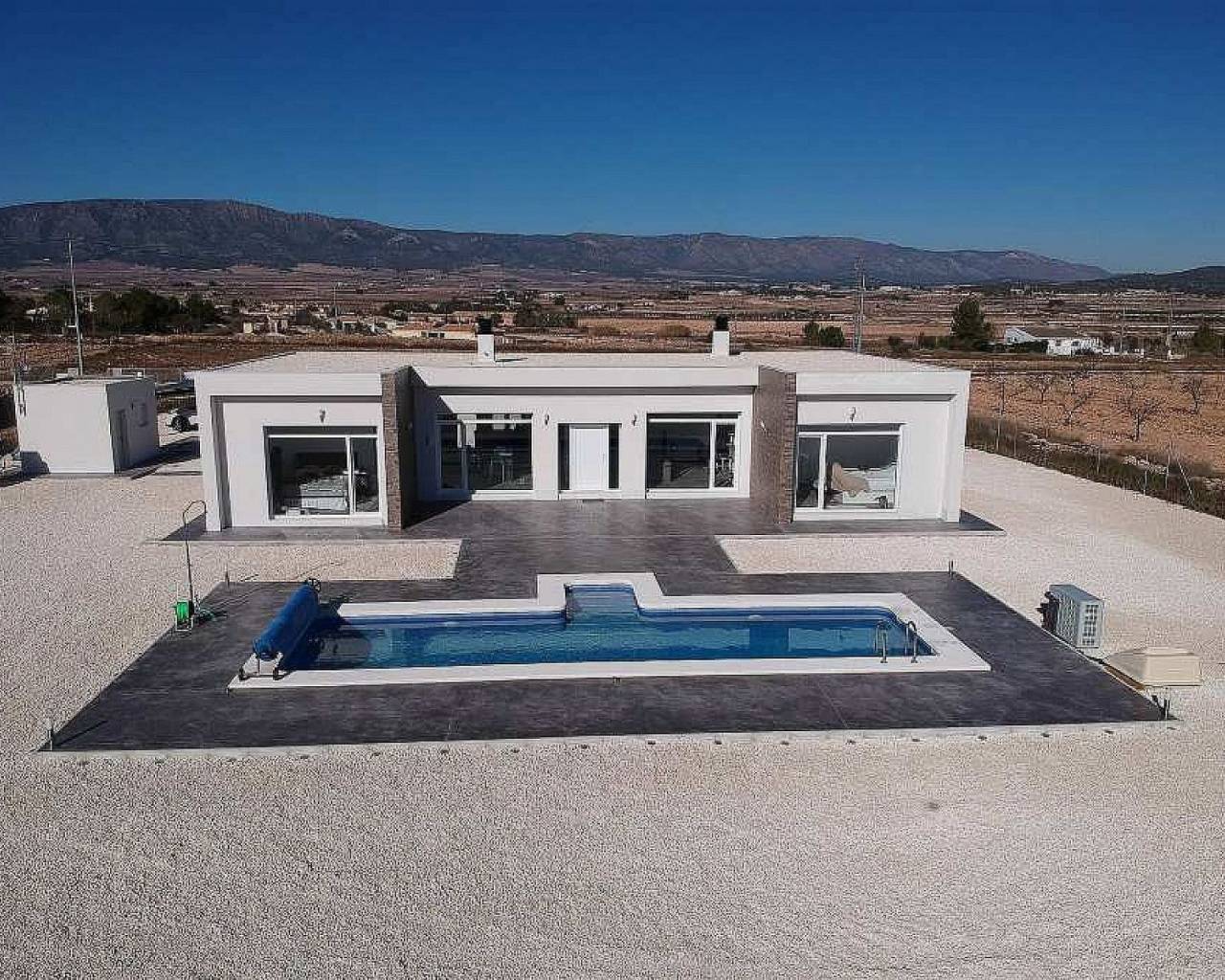 Villas modernas de 3 dormitorios en Pinoso: llave lista en 8 meses. Estas hermosas residencias de campo están personalizadas para los gustos personales de cada cliente. El modelo que se muestra en estas imágenes tiene una casa de invitados adicional de 30 m2 y más tarde los clientes añadieron una barbacoa y una cocina de verano.