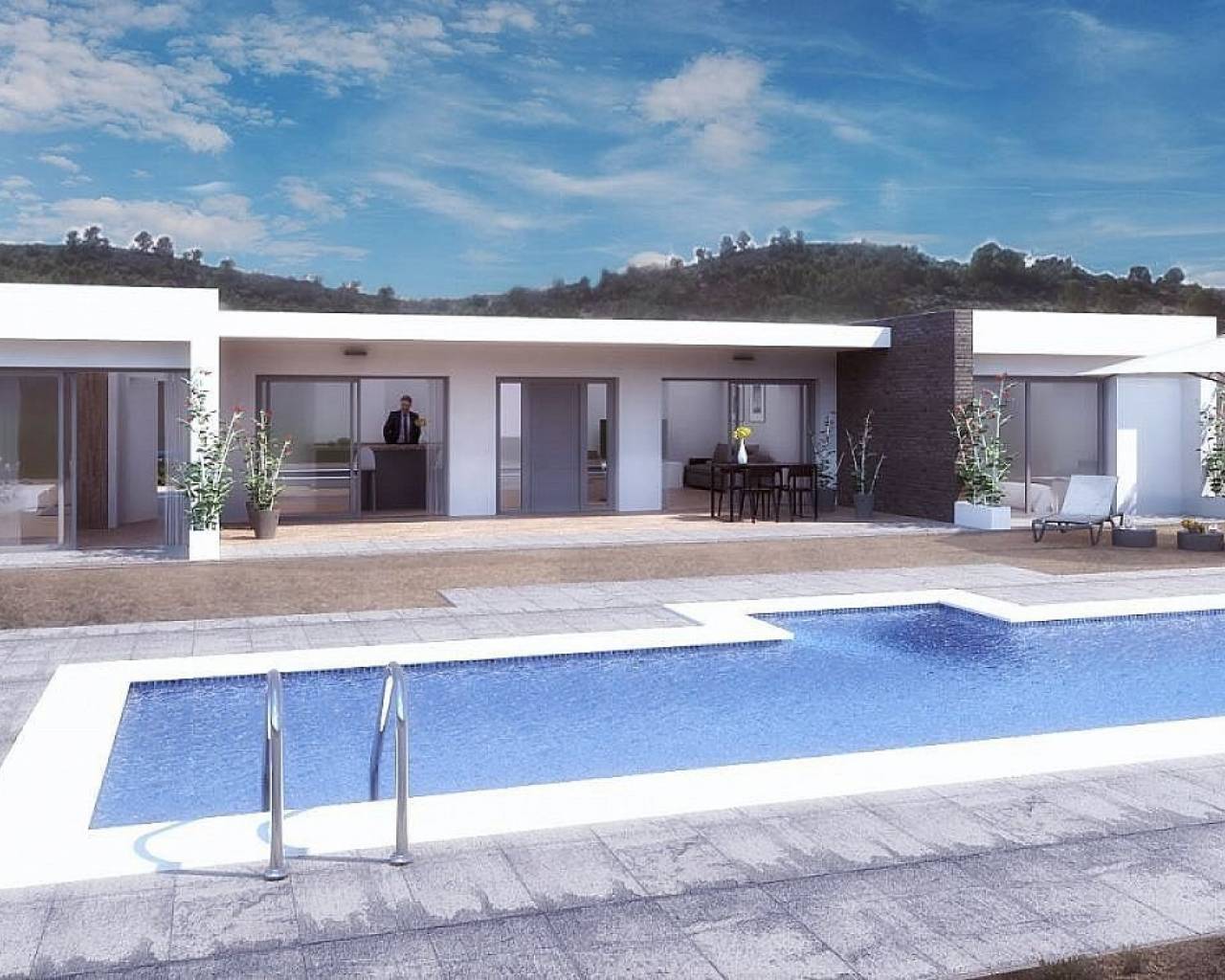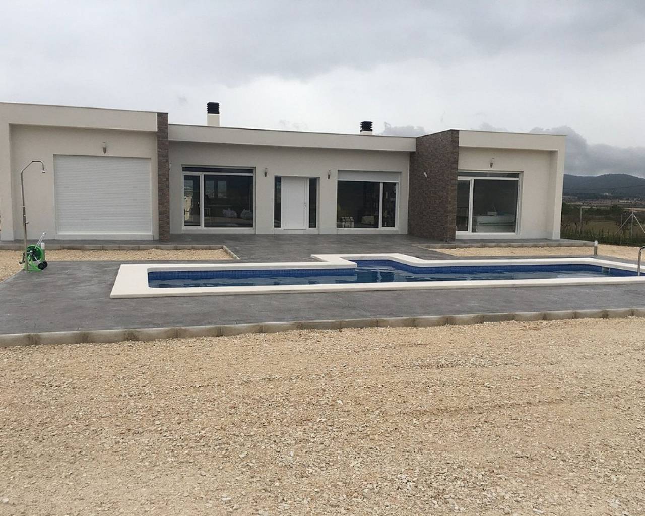 Todas las casas incluyen terraza de hormigón impreso de 2 m alrededor de la piscina (color y patrón a elegir), 1 m alrededor de la casa, entrada cerrada, vallado de 3000 m2, aire acondicionado por conductos preinstalado, cocina estándar, puerta de seguridad, ventanas alemanas oscilobatientes (o correderas si preferido), hogar y chimenea de obra, preinstalación de tv e internet, camino de grava más unos metros alrededor de la casa, fosa séptica.