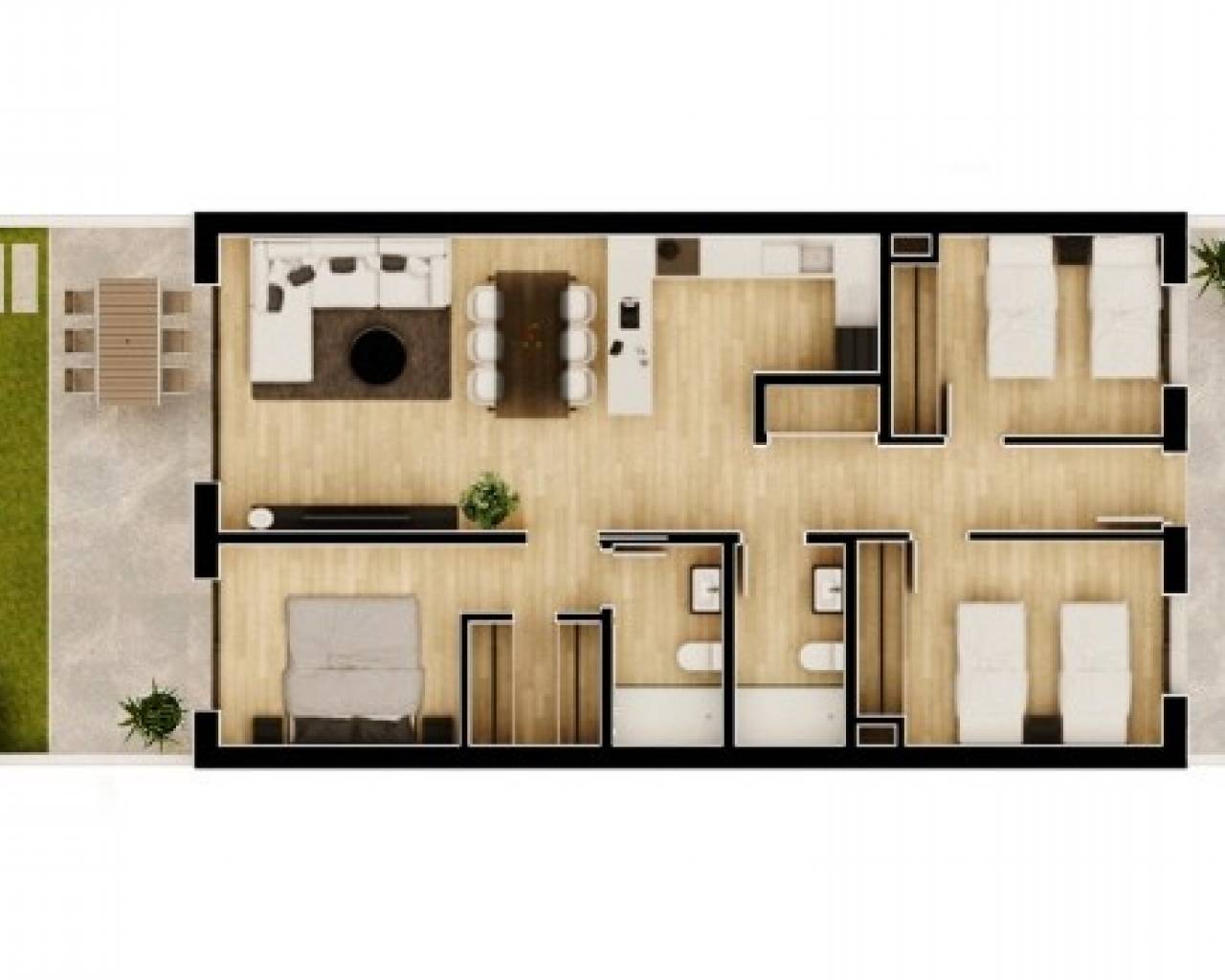 • Suelo laminado flotante en tono a elegir para toda la casa entre los modelos ofrecidos por el promotor, excepto en escaleras, que se acabarán con pavimento porcelánico.