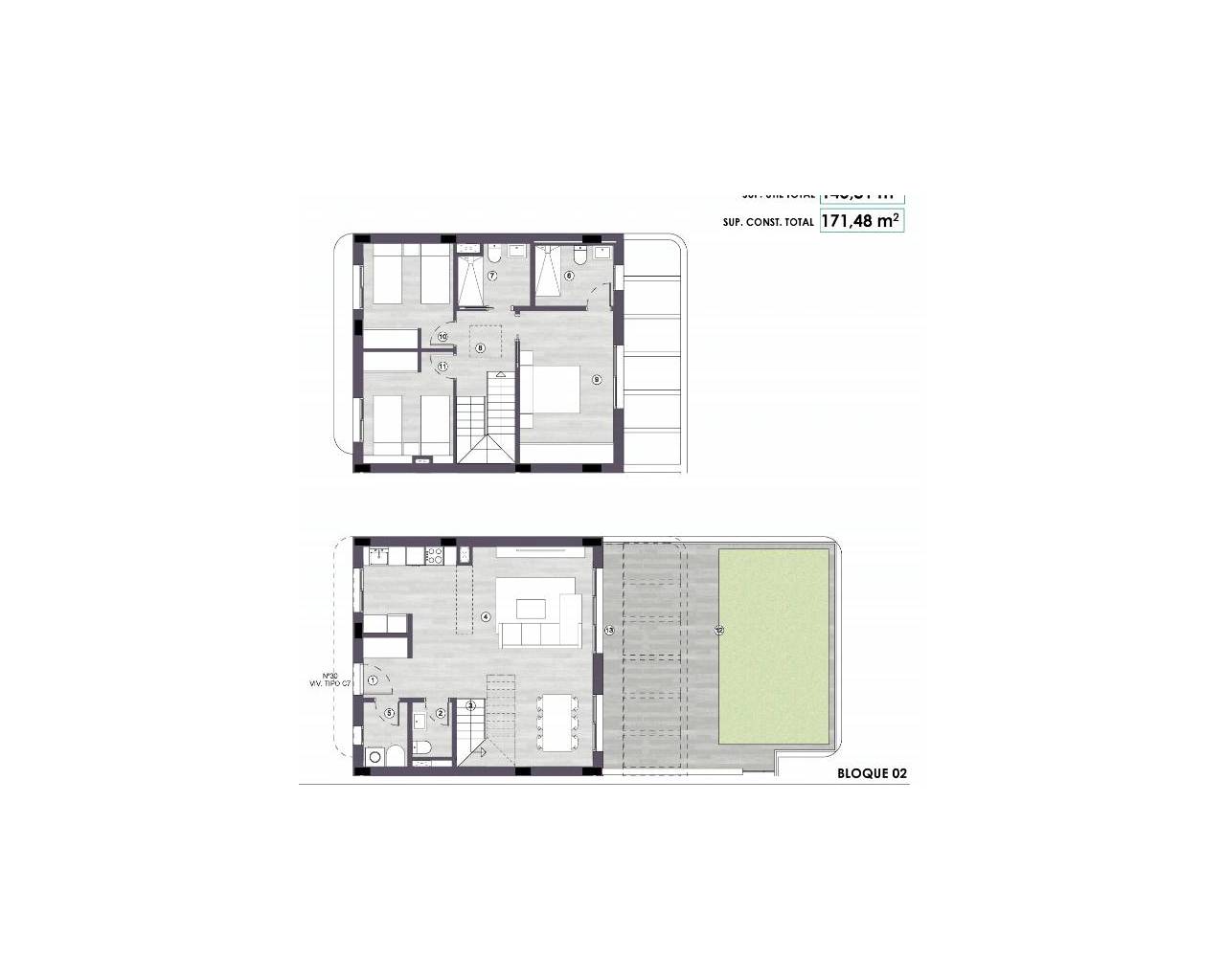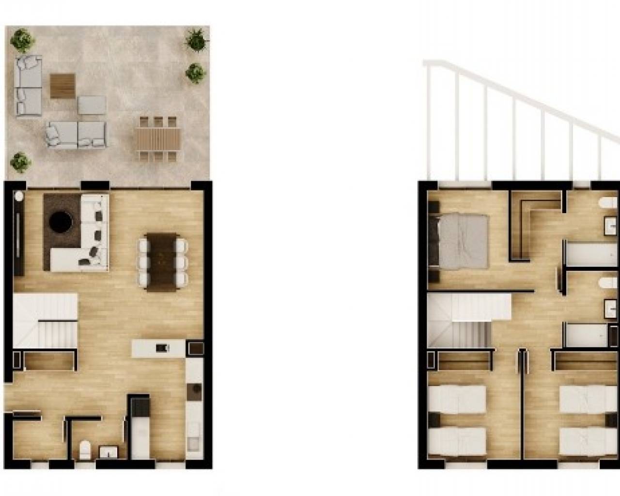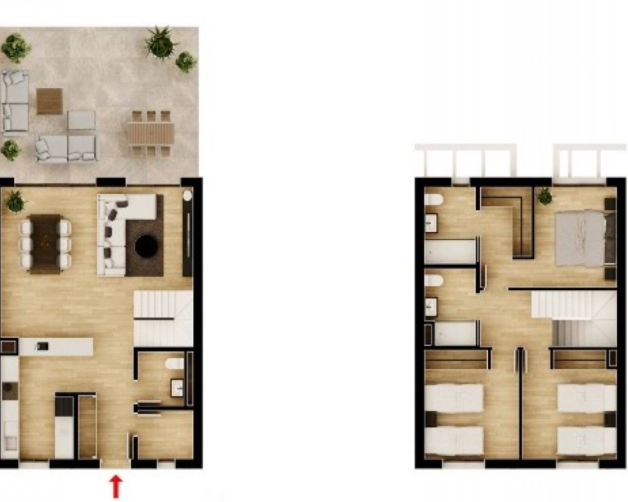 • Suelo laminado flotante en tono a elegir para toda la casa entre los modelos ofrecidos por el promotor, excepto en escaleras, que se acabarán con pavimento porcelánico.