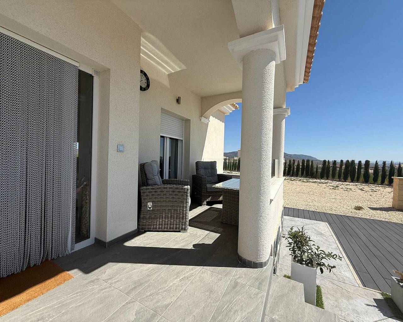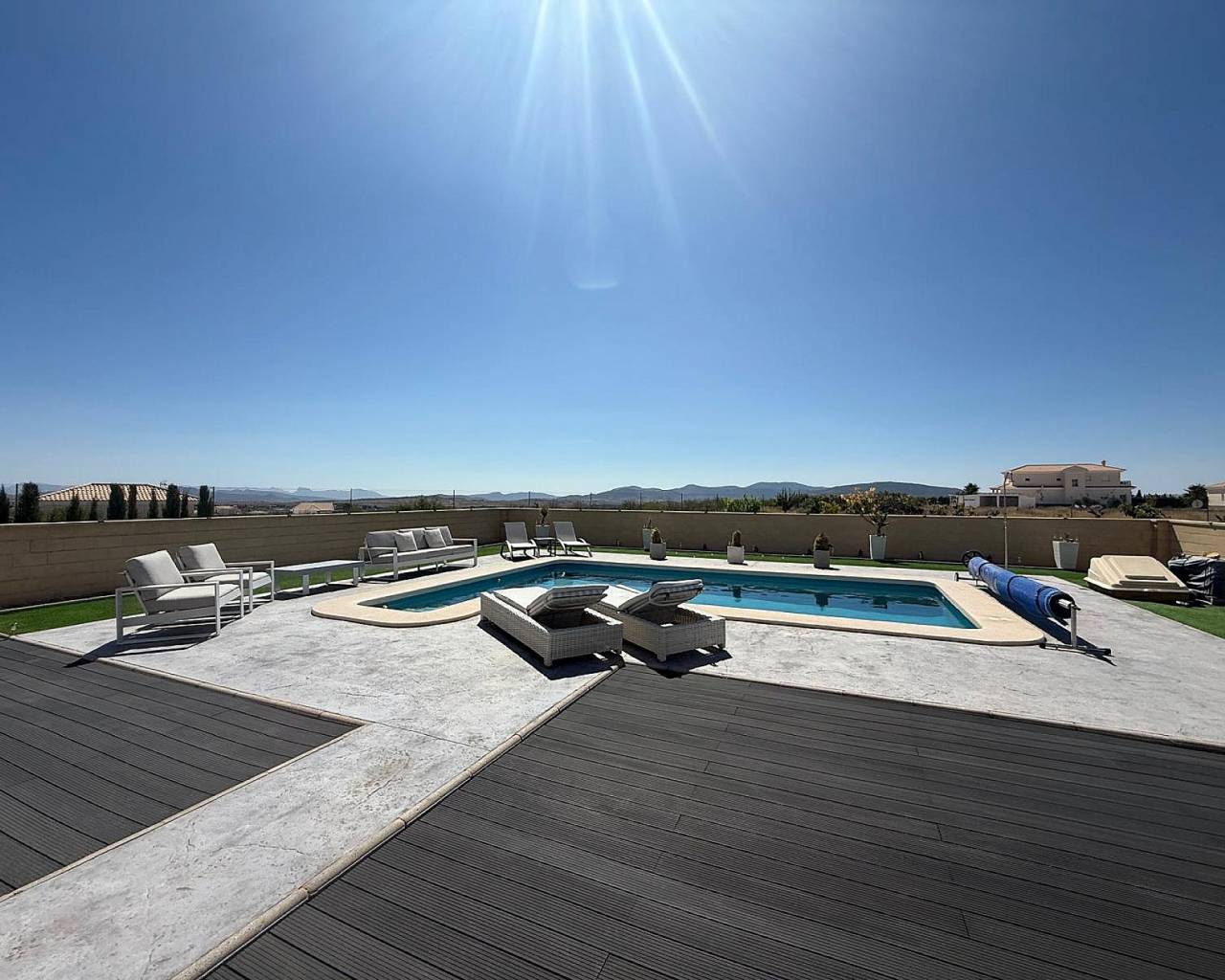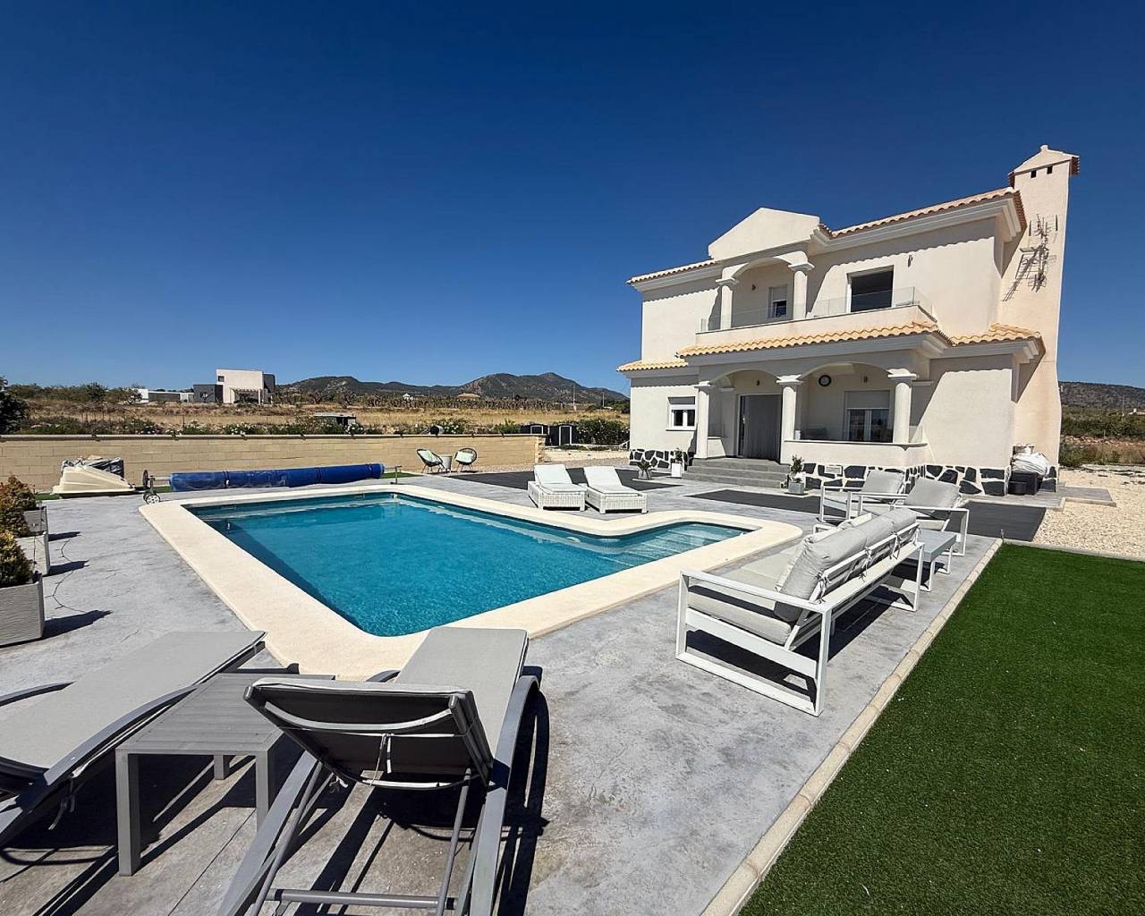 Hermosa villa de 3 dormitorios y 2 baños en Pinoso (llave en mano).. Nos complace presentar esta impresionante villa de 3 dormitorios y 3 baños en Pinoso, con piscina climatizada de agua salada y vistas espectaculares. ¡Qué hogar! Esta villa de hermoso diseño combina elegancia, confort y modernidad en un paquete perfecto. Ubicada en una zona tranquila con impresionantes vistas, esta propiedad ofrece todo lo necesario para la vida de sus sueños en España. Al entrar a esta casa, encontrará un acogedor porche y zona de estar, que se abre a un luminoso recibidor y un amplio salón de planta abierta donde encontrará una cocina de diseño totalmente equipada con electrodomésticos de alta calidad, acabados de alta calidad y una isla central, ideal para el entretenimiento. Dispone de 3 dormitorios decorados con buen gusto, el principal con baño en suite y balcón con vistas al impresionante paisaje. Los otros 2 baños cuentan con hermosos acabados elegantes que ofrecen comodidad y funcionalidad. Al salir al exterior, encontrará varias zonas de estar con vistas a la encantadora piscina climatizada de agua salada de Piscina climatizada de agua salada de 8 x 4 que también tiene una cubierta solar. Dispone de amplio espacio para crear la cocina o zona de barbacoa de sus sueños, con posibilidad de ampliar la vivienda y, quizás, añadir un garaje o una casita para invitados. El terreno cuenta con un precioso huerto frutal y a la entrada de la propiedad hay portones eléctricos con acceso por carretera asfaltada. Además, esta fabulosa casa, y para mayor eficiencia energética, cuenta con un sistema de energía solar de 7 kW, además de electricidad, agua potable y agua de riego. Esta villa está lista para entrar a vivir y empezar a vivir el estilo de vida mediterráneo de sus sueños. La ubicación es tranquila y está a un corto trayecto en coche de los servicios locales, bares y restaurantes del prometedor pueblo de Pinoso. ¿Qué más se puede pedir? Esta villa lo tiene todo. Date prisa, porque creemos que esta villa no tardará mucho en llegar. Reserva tu visita y descubre por ti mismo la joya que es esta encantadora casa. Acerca de Pinoso. Pinoso cuenta con todos los servicios necesarios: supermercados como Consum, Dia, Mas y Más e Hiperber, una amplia gama de restaurantes, incluyendo comida irlandesa e india, y bares (para mayores de 50 años), centro médico 24 horas, dentistas angloparlantes, veterinario, tiendas, bares, restaurantes, etc. Además, celebra un mercado semanal los sábados y un mercado interior abierto 6 días a la semana. Pinoso cuenta con tres escuelas primarias, un instituto y una escuela de música. También hay un nuevo centro cultural con biblioteca y clases de español para extranjeros. Es uno de los pueblos más ricos de España, con una mina de mármol, una próspera industria del calzado, yacimientos de sal y una floreciente industria vinícola y agrícola. El pueblo se encuentra en la campiña montañosa de la región vinícola de Alicante, a 45-50 minutos en coche del aeropuerto, la ciudad y las playas de Alicante, y cerca de la frontera con Murcia. La ciudad de Elda y Petrer se encuentra a 20 minutos en coche. Cuenta con un gran hospital con médicos que hablan inglés, una amplia variedad de bares y restaurantes, un centro comercial cubierto, un gran gimnasio internacional, Carrefour, Aldi, Lidl, un cine con películas inglesas semanales, bolera y locales de comida rápida. A lo largo del año, Pinoso celebra sus tradicionales fiestas con desfiles y actuaciones musicales de renombre nacional, hogueras con un ambiente mágico y la gente sale a la calle. También se celebra anualmente un encierro de toros (¡a los toros no se les hace daño!) que atrae a multitudes de toda la región para ver a los valientes participantes unirse a los toros en la plaza especial.