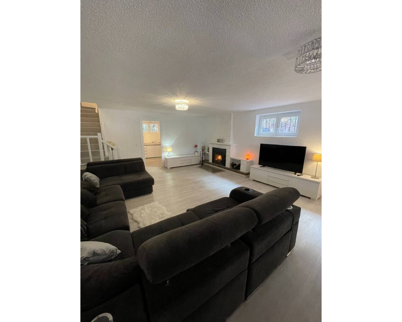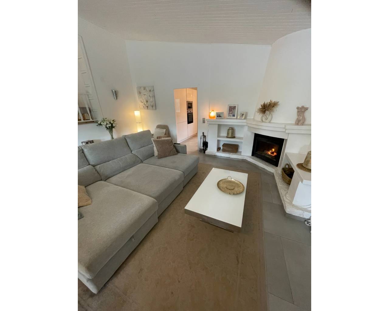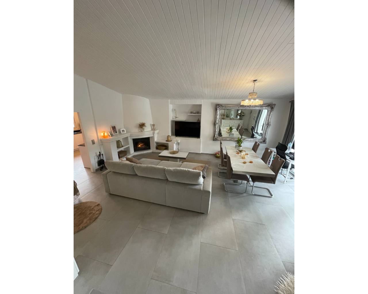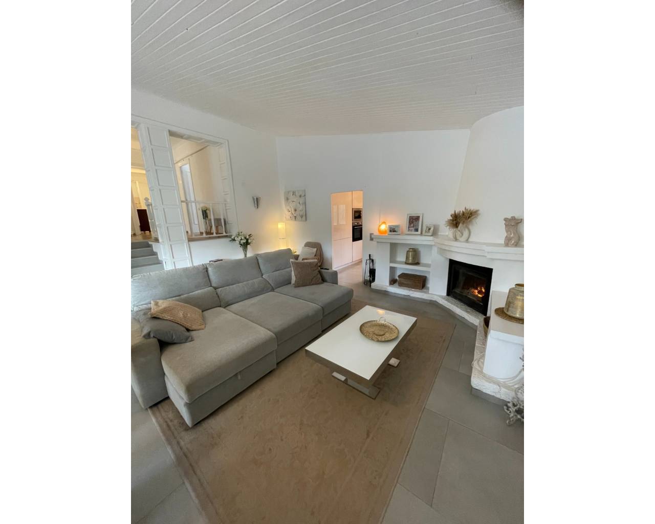 El impresionante salón de 40 m² ha sido completamente alicatado y pintado, cuenta con una chimenea cassette acogedora y grandes puertas correderas que se abren a una terraza de 24 m² con vistas tranquilas al jardín.