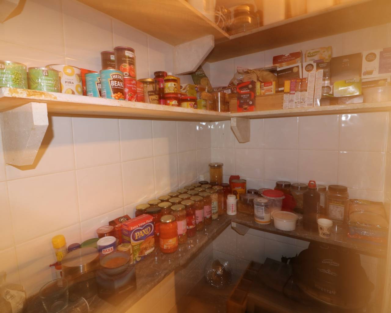 Una cocina moderna con abundante espacio de almacenaje y despensa.
