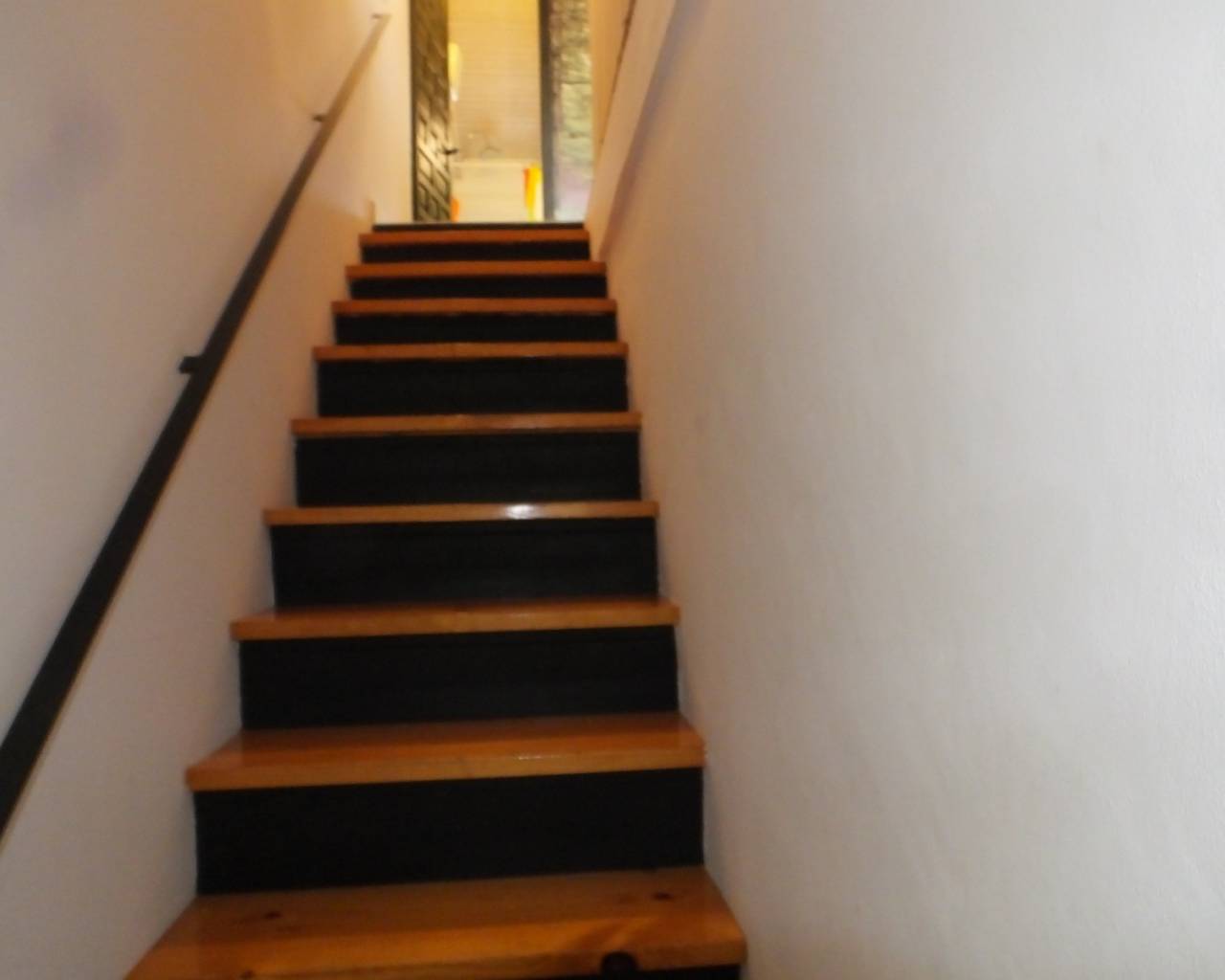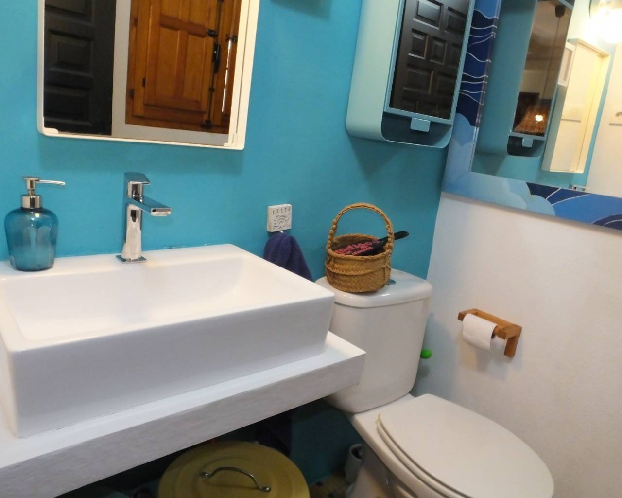 La escalera nos lleva desde el salón hasta el primer piso que cuenta con un amplio cuarto de ducha con lavabo, bidé y WC, con un bonito suelo de azulejos azules.