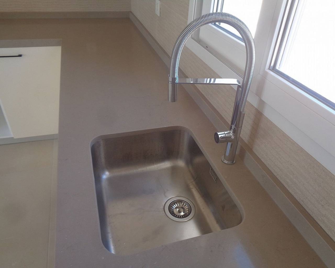 Les cuisines comprennent des armoires avec portes et poignées standard, selon les plans fournis, un évier et un robinet en acier inoxydable, une pré-installation pour four, lave-vaisselle et hotte. Différents plans de travail en granit au choix inclus dans le budget, autres plans de travail en pierre disponibles en extras. Produits blancs non inclus.