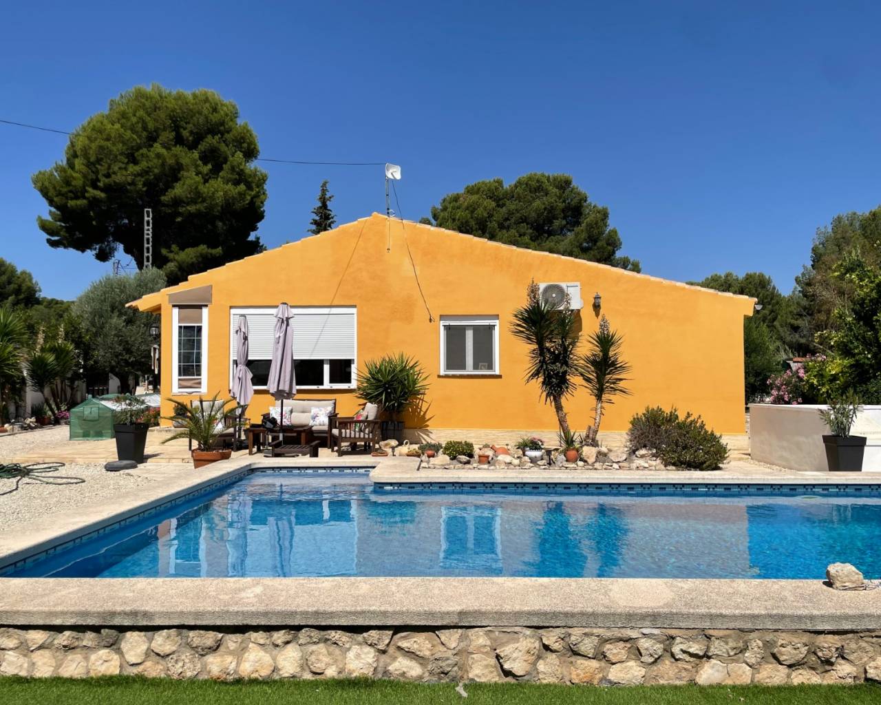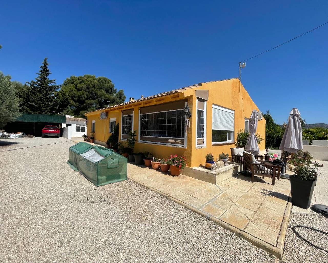 Découvrez cette magnifique maison de plain-pied de trois chambres située à seulement trois minutes en voiture (ou une agréable promenade) du charmant village de Castalla, Alicante. Située sur un terrain ensoleillé, privé et spacieux de 1900m², cette propriété est une véritable oasis de tranquillité avec ses jardins paysagers, son terrain de pétanque et une magnifique piscine.
