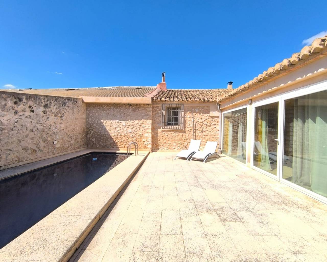 DESCRIPTION Spacieuse maison de campagne avec piscine et grand terrain à Campo de Mirra (près de Villena) Cette vaste demeure de campagne se situe dans le paisible village de Campo de Mirra, aux portes de Villena, offrant espace, intimité et un cadre de vie rural confortable. Implantée sur un terrain de 20 000 m², dont 4 000 m² sont clôturés autour de la maison, la propriété comprend une maison de 588 m², des jardins paysagers, des arbres matures et plusieurs espaces de vie extérieurs aménagés pour profiter pleinement de la campagne environnante. La maison comprend actuellement quatre chambres et deux salles de bains, avec la possibilité d'en créer jusqu'à six supplémentaires si nécessaire. Actuellement, un grand studio (environ 250 m²) et un espace créatif offrent un cadre idéal pour les artistes en herbe ou toute personne souhaitant un atelier indépendant. Ce bel espace lumineux pourrait également être aménagé en logement indépendant, à louer ou à accueillir famille et amis. À l'intérieur, la propriété comprend un vaste hall d'entrée, de généreuses pièces à vivre et une grande suite parentale avec dressing et salle de bains attenante équipée d'une douche à l'italienne. La maison allie le charme traditionnel au confort moderne, avec notamment des sols en béton poli, des fenêtres de sécurité et un poêle à bois pour un confort optimal en toute saison. La toiture a été réparée, traitée et isolée, contribuant ainsi à la qualité générale de la propriété. L'agencement comprend également une grande véranda vitrée, idéale comme espace de détente ou de repas supplémentaire avec vue sur le jardin. Un four traditionnel tricentenaire confère à la propriété une touche historique unique. À l'extérieur, la maison bénéficie de plusieurs espaces agréables pour se détendre et recevoir. On y trouve une piscine de 10 x 2,5 mètres intégrée à une terrasse pavée de pierres fossilisées, ainsi qu'un espace barbecue et une terrasse arrière. Le terrain comprend des jardins paysagers et un espace planté devant la maison. Parmi les autres atouts pratiques, on trouve deux garages (actuellement sans portes), un débarras et un parking extérieur séparé. La cour principale peut être sécurisée par un portail électrique. Une annexe indépendante pourrait être reliée à l'étage pour créer un appartement indépendant destiné aux invités ou à la famille. La propriété est raccordée à l'eau courante et à l'électricité, comprend un détartrant et bénéficie d'un accès par route goudronnée, ce qui la rend facilement accessible tout en permettant de profiter de la tranquillité de la campagne. Veuillez noter que la propriété est mitoyenne des deux côtés, mais qu'en raison des cyprès et de sa configuration, elle est extrêmement privée. À propos de la région Campo de Mirra est un petit village traditionnel situé entre Villena et les vallées intérieures d'Alicante. La région est réputée pour ses vastes paysages, ses vignobles et son cadre de vie rural paisible. La ville voisine de Villena offre tous les services nécessaires : commerces, restaurants, écoles et une gare TGV desservant Alicante, Madrid et Valence. L'aéroport d'Alicante et la côte méditerranéenne sont également facilement accessibles en voiture, faisant de ce village un lieu de vie à la fois paisible et bien desservi. Nous disposons d'un vaste portefeuille de propriétés sur la Costa Blanca et la Costa Calida, spécialisées dans les maisons de campagne, villas, fincas, terrains à bâtir et projets de conception-construction dans les régions d'Alicante et de Murcie, avec une expertise particulière à Elda, Monovar, Pinoso, Sax, Villena, Aspe, Fortuna, Albacete et leurs environs. Fondée en 2004, notre équipe cumule des décennies d'expérience pour vous accompagner dans la recherche et l'acquisition de votre nouvelle maison idéale. Nous vous assistons à chaque étape pour que votre achat en Espagne se déroule en toute sérénité. Notre objectif n'est pas simplement de vous vendre un bien, mais de vous aider à concrétiser votre rêve et à trouver la propriété qui vous correspond. Avec nous, vous êtes entre de bonnes mains. Contactez-nous dès maintenant pour discuter, sans engagement, de la manière dont vous aussi pouvez réaliser vos rêves.