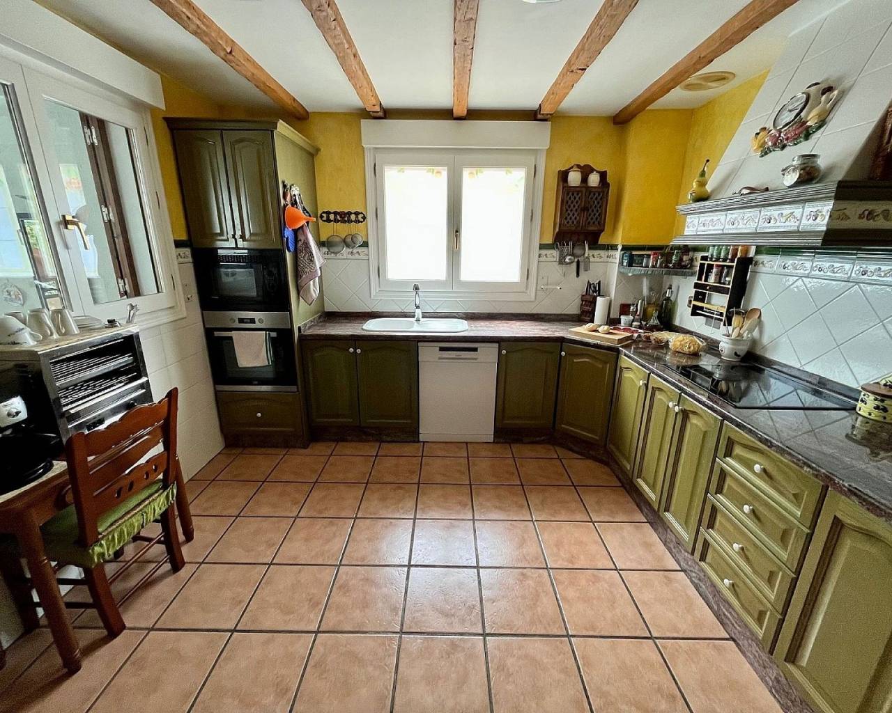 Woonkamer en keuken met bijkeuken en badkamer met douche. Vanuit de keuken is er toegang tot een tuinhuisje, waar zich een keuken met barbecue bevindt. Er is ook een overdekt en verwarmd zwembad met zout water. Van daaruit is er toegang tot een kelder van 100 m2, met een keuken, toilet en ambachtelijke houtoven. Er is nog een semi-kelder met een boiler en verwarmingstank. Garage voor twee auto's.