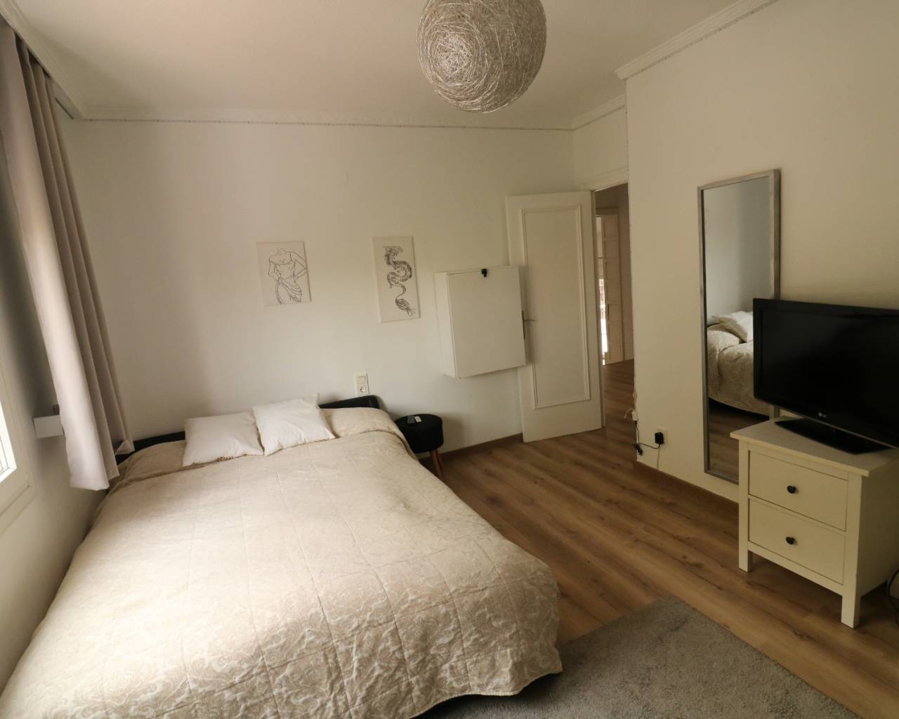 A large modern bedroom fully renovated with hot/cold air conditioning and a stylish new bathroom